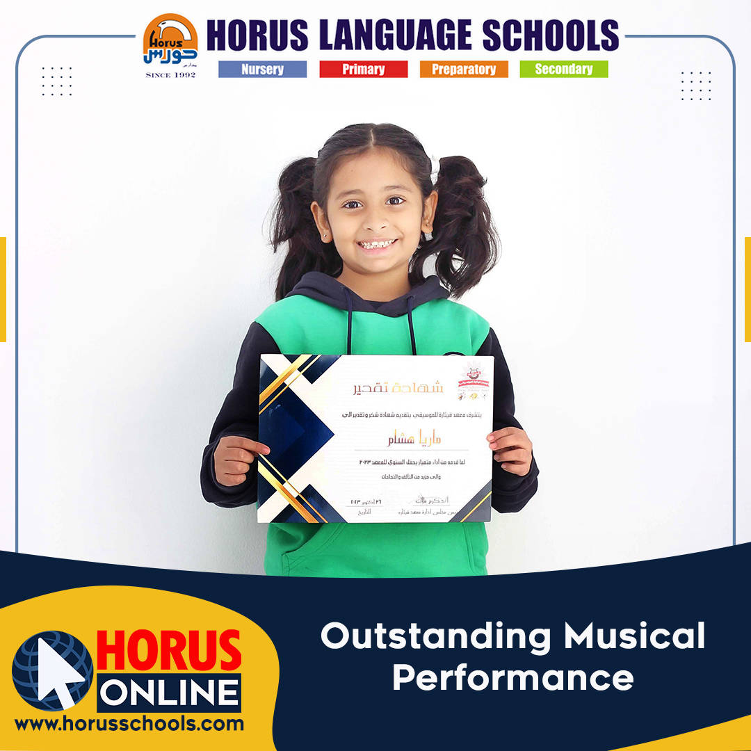 Horus language Schools administration congratulates Maria Hesham “2nd primary D “ for getting certificate of appreciation in playing music .