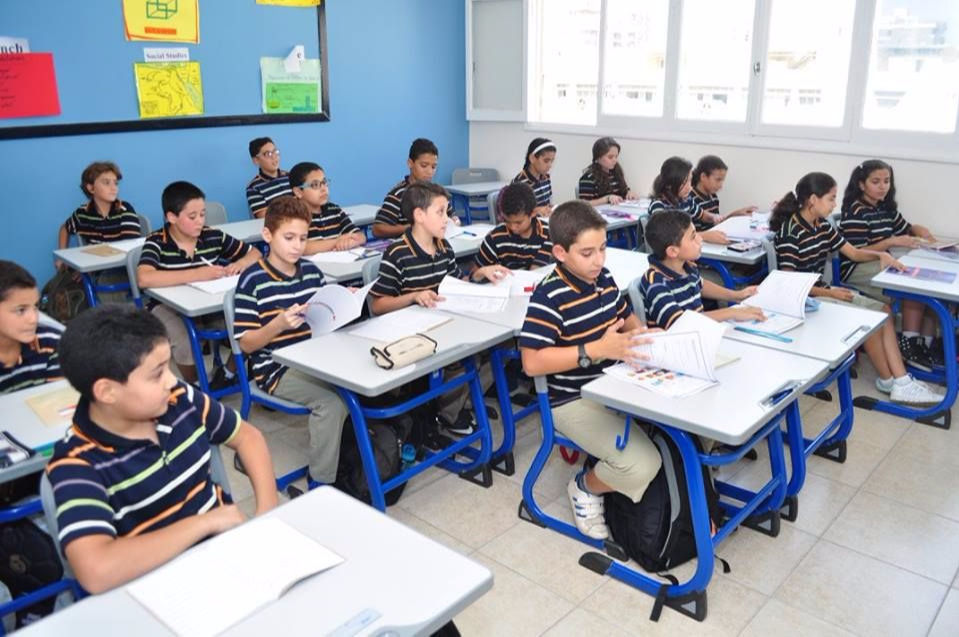 Schedule includes main subjects (English- Math – Arabic- Science, French & Social) and activities (Art, PE, Music, Computer, Religion, Domestics and Library).
